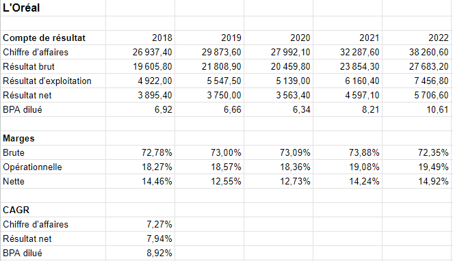 Pour approfondir un peu l’analyse, on va donc maintenant calculer les marges brute, opérationnelle et nette de L’Oréal ainsi que le taux de croissance moyen annualisé (CAGR) du chiffres d’affaires, du résultat net et du bénéfice par action dilué.