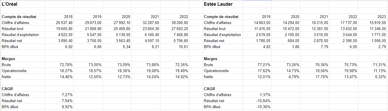 Maintenant qu’on a bien analysé le compte de résultat de L’Oréal et qu’on dispose d’une référence dans l’industrie des cosmétiques, on va pouvoir comparer les résultats de L’Oréal avec ceux de son concurrent historique : Estée Lauder.