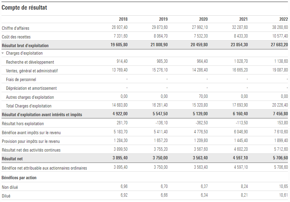 C’est une étape importante de votre analyse fondamentale : analyser l’évolution des différents postes du compte sur les 5 dernières années, s’assurer qu’elle ne perd jamais d’argent (même quand les temps sont durs), évaluer les dépenses et comparer les performances avec un concurrent.